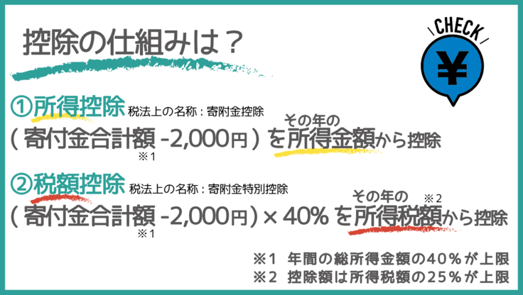・個人の場合:2000円以上の寄附をされた方は、寄附金領収書を添えて確定申告を行うことで所得税に関する優遇措置として「税額控除」か「所得控除」のうち有利な方を選択できます。一部の住民税についても優遇措置の対象となる場合があります。