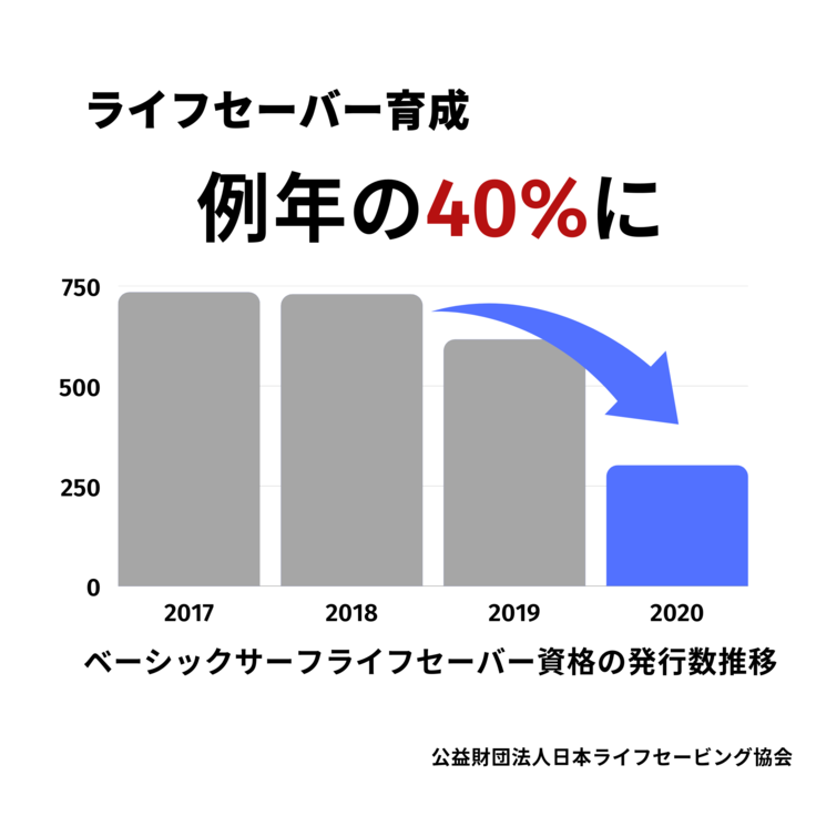 新型コロナウイルスの影響で2020年の資格発行数が例年の40%に落ち込み、このままだとライフセーバーが今よりも足りなくなってしまいます。