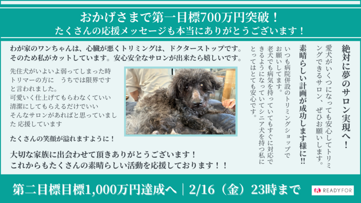 安心で安全な愛犬と飼い主さんの居場所作りのための第二目標金額を1,000万円とさせていただき、いただいたご支援は引き続き、啓発型トリミングサロンのさらなる向上のための費用(痴呆の子たちのための防音室の設置費|200万円)と、リターンに使ったオリジナル絵本の白い犬のアオの増版(500部|100万円)に充てさせていただきます。