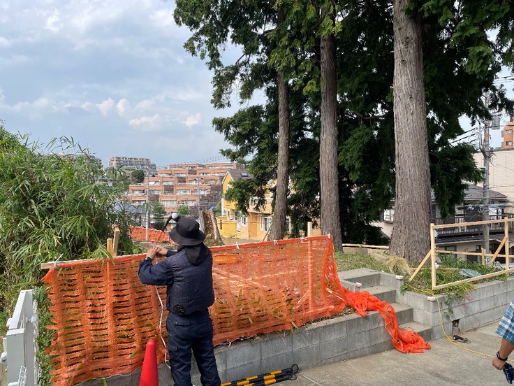 防災倉庫の移動で広々した丘の周りにガードを取り付け、安全を確保。