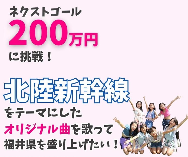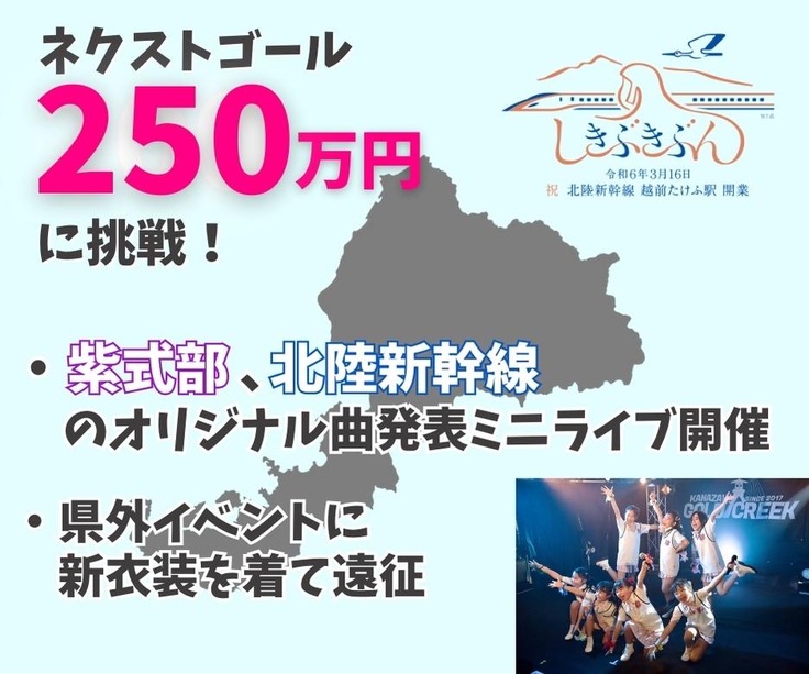 皆様のご支援が積み重なり、200万円に到達したことにより、「紫式部」「北陸新幹線」それぞれをイメージしたオリジナルの楽曲を制作させて頂くことが決まりました。来年2024年3月16日「北陸新幹線」開業日に向けて、新曲制作、歌、ダンスの練習を全力で頑張ります!