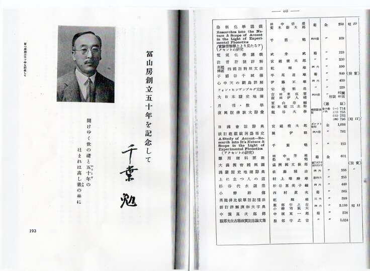 冨山房創立50周年の記念本には、昭和10年に千葉勉先生がアクセント研究の本を出版した記録があった。(2つあるのは、英語版と日本語版の両方が出版されたから)