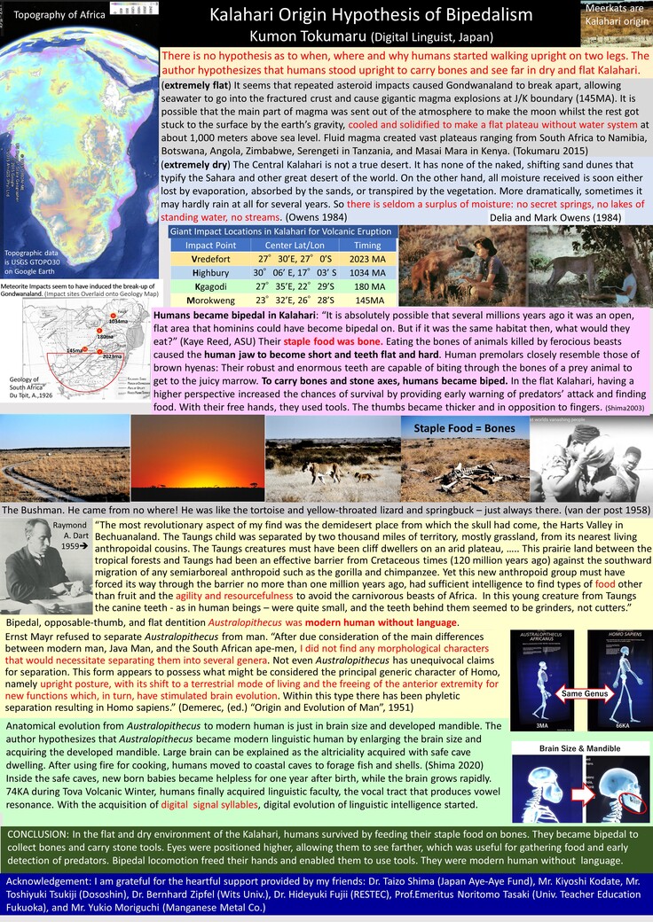 カラハリ砂漠で直立二足歩行になったことを、カラハリ砂漠がどんな地形で、どんな気候だったか、そのときのヒトの主食は何だったか、といったところから論じています。そして、分類学者のエルンスト・マイアの言葉を引用して、アウストラロピテクスと現生人類は同じ属であるというところから、現生人類への進化についても考えたことを書きました。