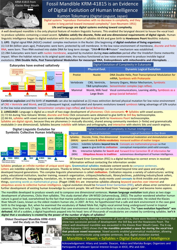 こちらは、生命の40億年の進化の最終段階に、ヒトの言語が位置づけられるという話です。そしてクラシーズ河口洞窟で発掘されたオトガイKRM41815は、ヒトの知能のデジタル進化の証拠であることを示しています。