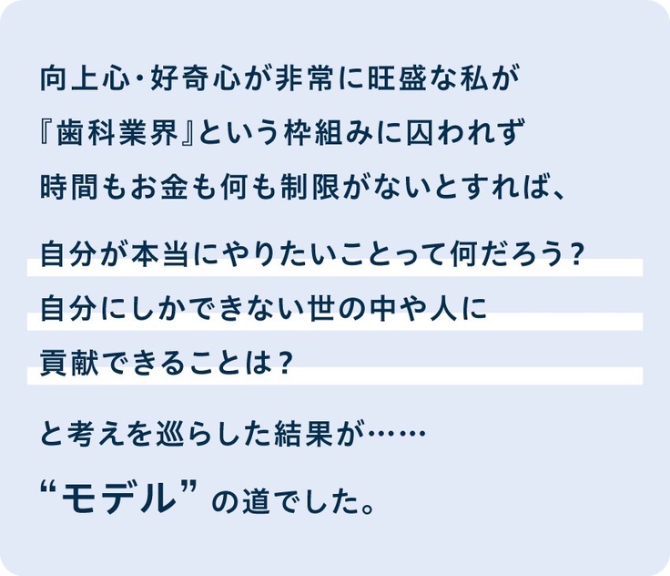 しかし、新型コロナウイルスが猛威を振るい始めたころ、その影響により歯科衛生士としてのお仕事や自分のやりたいことが制限されてしまった中で、自分自身を見つめ直す時間が増えました。
