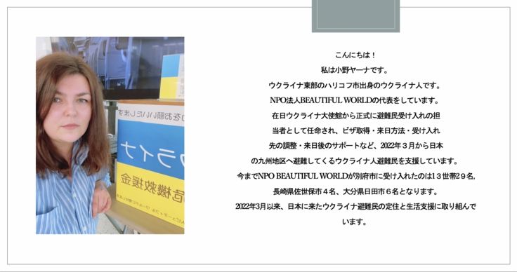 小野ヤーナ ウクライナ出身 私はウクライナで生まれましたが、17年以上日本に住み、働いています。 私の祖国や周辺国で困っている障がい者を、約10年間個人的に支援した後、もっと活動の手を広げたいと2021年にNPO法人を組織することにしました。 私個人だけではなくもっと多くの人に継続的に支援していただける仕組みを作りたく、この事業をもっとグローバルに行い、NPO法人Beautiful Worldを組織することにしました。 私のアイデアをサポートしてくれたすべてのメンバーに感謝します。将来的には、私たちの組織が拡大し、さまざまな国でできるだけ多くの困っている人々を支援できるようになることを願っています。