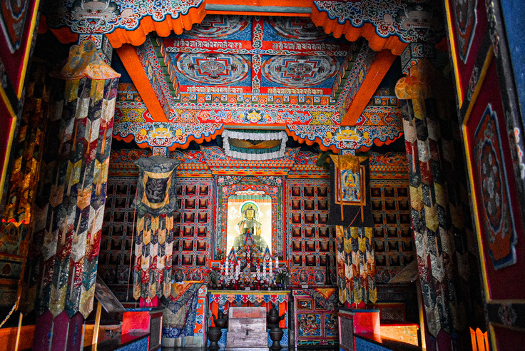 本堂内部の壁面を埋め尽くす極彩色の「曼陀羅」と「仏画」は圧巻の美しさです。完成した際には、寺院の落慶・入魂法要と、現地に伝わる仮面舞踊『マニ・リムドゥ』が公演されました。