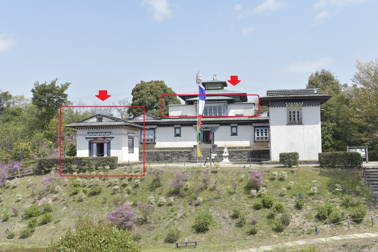 本堂2階には1階と同様に美しい内部壁画が施されているほか、チベット仏教ニンマ派の開祖「グル・リンポチェ」が安置されています。
