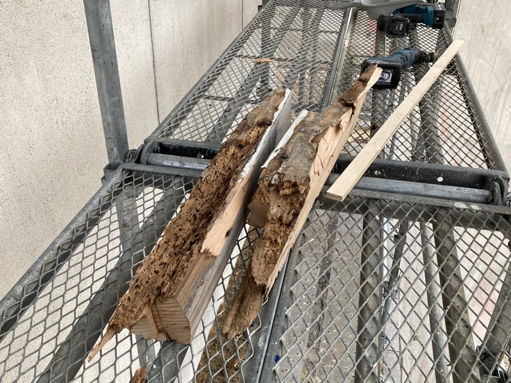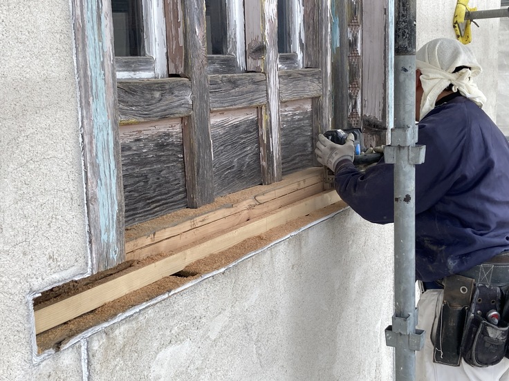 窓枠(木材)のうち、傷みの激しい部分を取り外し、新しい材をはめていきます。