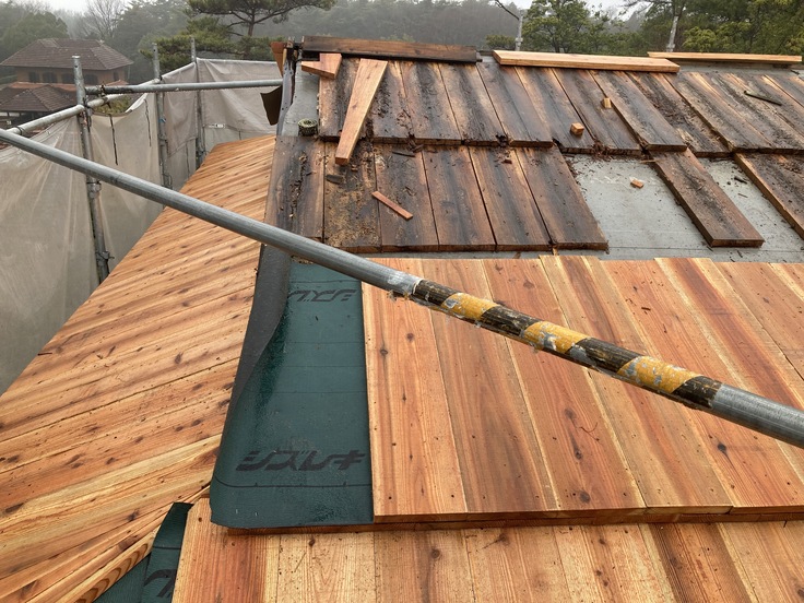 傷んだ屋根材が取り除かれ、新しい屋根材が葺かれました。