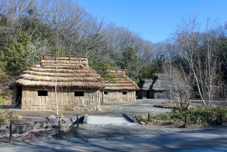 「北海道 アイヌの家」展示の様子。左2棟が分家、右奥の建物が母屋。