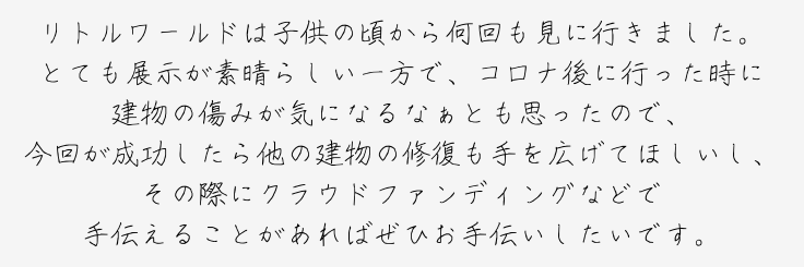 ※支援完了時に「応援コメント」としていただいたメッセージは、本プロジェクトのPRのために利用させていただく場合がございます。あらかじめご承知おきください。