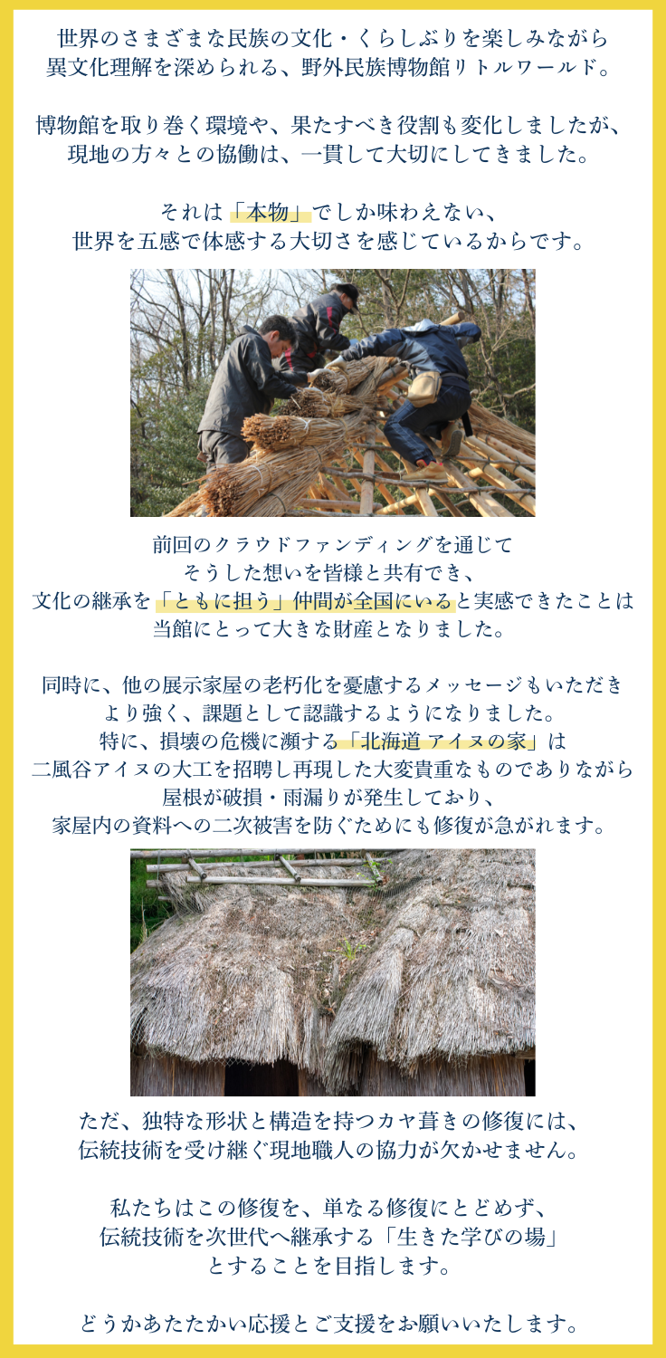 ■ 資金使途 :野外民族博物館リトルワールドが有する復元展示家屋「北海道 アイヌの家」母屋、男女便所、クマの檻、高倉の修復のための職人招聘費用、クラウドファンディング諸経費
