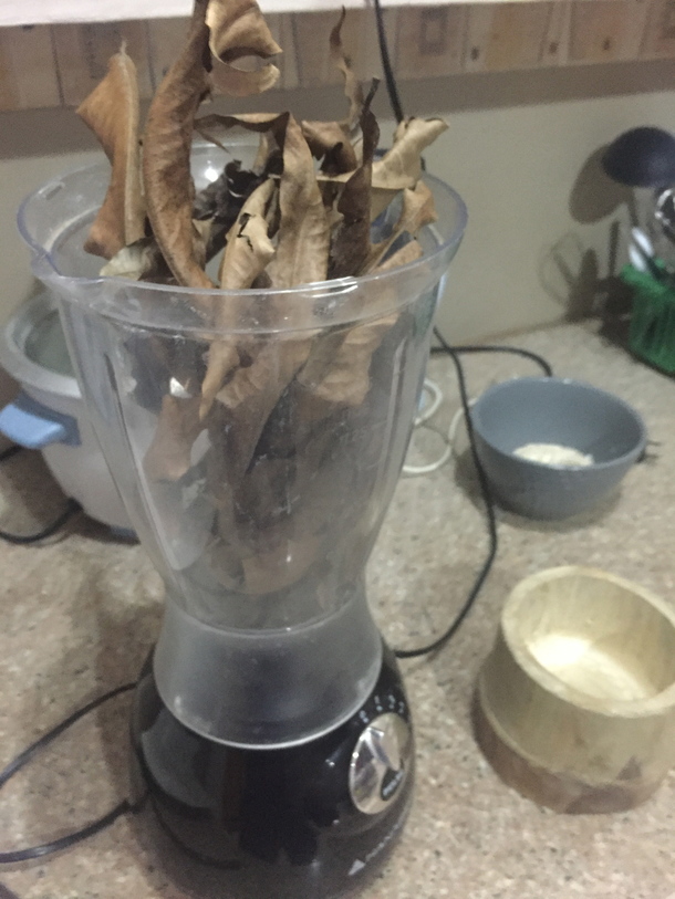 茶色の顔料を創ろうと、枯れ葉集めてミキサーに。蓋締め忘れて、部屋中茶色スモッグ。。。