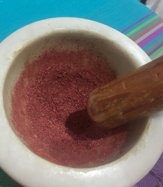 花を乾燥させて、すり鉢ですりすり。このすり鉢は借り物なのに、赤が洗っても落ちず、オーナーさんにめちゃ誤った。。。