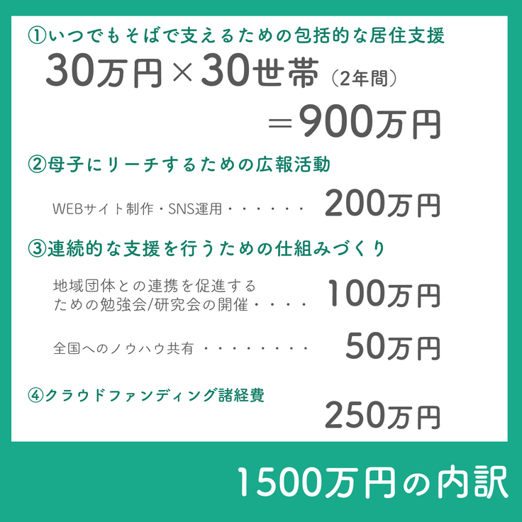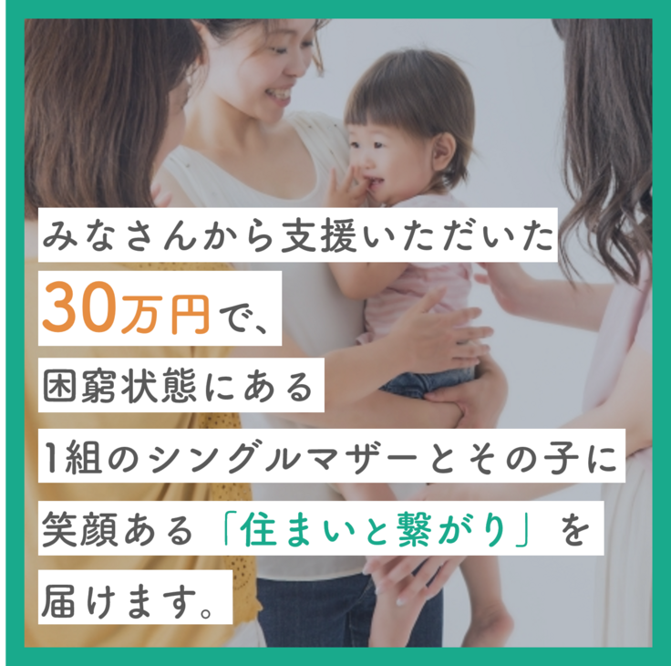私たちは2年間で30世帯のシングルマザー、そして子どもたちに「住まいと繋がり」を届けるために1500万円をゴールに設定しました。