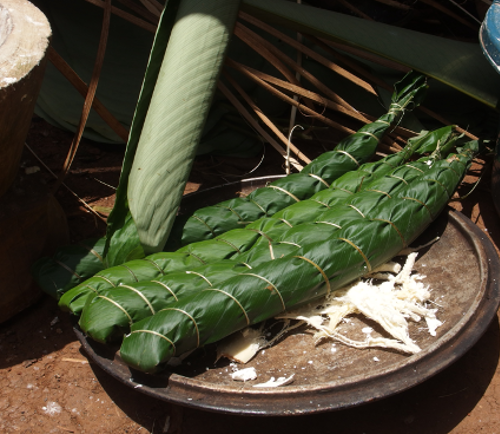 また、クスクスの粉を水と混ぜて細長く形成し、大判の葉で巻いて蒸したもの(バトン・ド・マニオク)は、まるでちまきのよう!ぷるぷるしていて発酵した香りがクセになります。