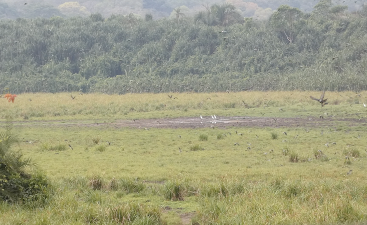 私たちに同行してくれた、レンジャー2人とポーターが近辺をパトロールし、密猟者の気配がないことを確認してくれたおかげで、翌朝はいつも通りに姿を見せてくれた大群のアオバトとヨウムでした。(カカシがあったところより、手前の湿地に着陸していましたが…)