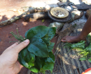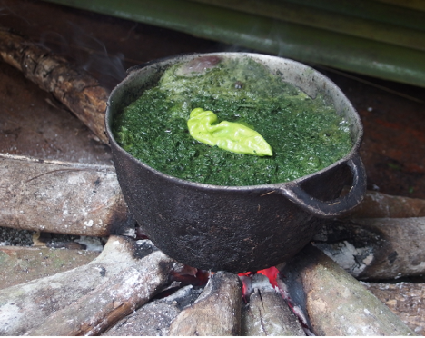 前回ご紹介したキャッサバは、根の部分だけでなく、葉も食べられるのです!コンゴなどでは、蒸留酒としても飲まれています。しかも鉄分が豊富で栄養満点!摘み取った葉の茎を除いて、臼で丹念に潰し、鍋で煮込み、塩と唐辛子で味付けしたら完成。バカの超定番料理の完成です。ちなみにカメルーン全土で食べられている国民的食材です。