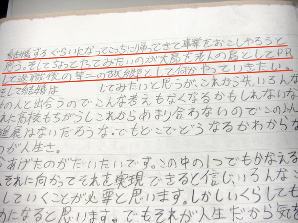 4月からは、家族も友人もいない全く新しい環境で、自分は何を学び、どこへ向かうのか。不安ではありましたが、希望の方が大きかったと思います。“島おこし”という誰にも習うことができない、将来の仕事をつくるためには、島を早く出て、都会で修行し成長し、そして、なるべく早く島に帰って来る。自分で決めた、自分への約束。それを、このページに書き綴ったのです。