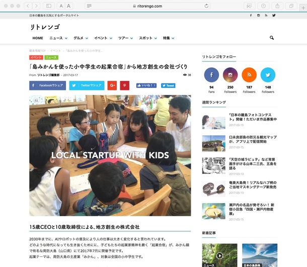 “「島みかんを使った小中学生の起業合宿」から地方創生の会社づくり”という見出しにて、日本の離島を元気にするポータルサイト「リトレンゴ」に掲載されました。