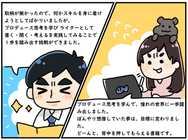本書製作チームは、私も含め、編集者・デザイナー・イラスト・書籍ライターの計5名で構成されています。実は、その内、イラストとライターはそれぞれサラリーマンで「新しいことに挑戦したいけど、できていない人」でした。 私も初出版であり実践者の1人ですが、この2人も『プロデュース思考』を実践して本書の製作に携わりっています。