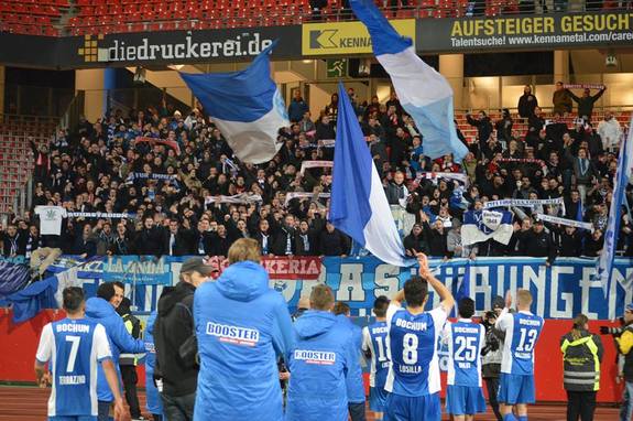 ボーフムの選手。選手とサポーターが共に勝利の喜びを分かち合う)