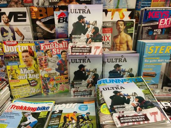 (ヨーロッパではサッカー専門誌と共にサポーターが主役の写真集が置かれている)