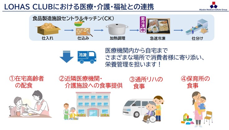 この状況を打破する為、従来の医療モデル「予防」「健診」「治療」だけでなく、更なる食事栄養管理サービスの提供、フードロス削減を実行していくための研究、最新の急速冷凍技術を活用しての患者様の栄養管理等、「食」を加えた新たなサービスを今年度秋に展開できるよう、事業を進めています。
