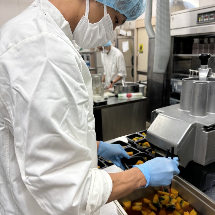 料理長に試作してもらった料理を商品として販売するために、どのように包材に詰めたら、見栄え良く出来るかを考えながら、盛付けています。