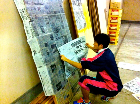 全てを買う余裕なんて無い!みんなであちこち声をかけて、古新聞集めたり発泡スチロールも集めて、ホームセンターに行って木材や釘や糊、小道具を探してはつくる。
