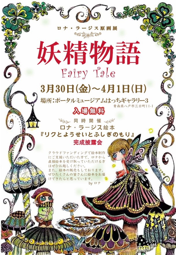 ここで、お知らせなのですが、3月30日(金)から4月1日(日)まで、ロナの作品展「妖精物語」を八戸ポータルミュージアムはっち3Fにて開催いたします。その時に同時開催として、絵本完成披露会も行う予定です。