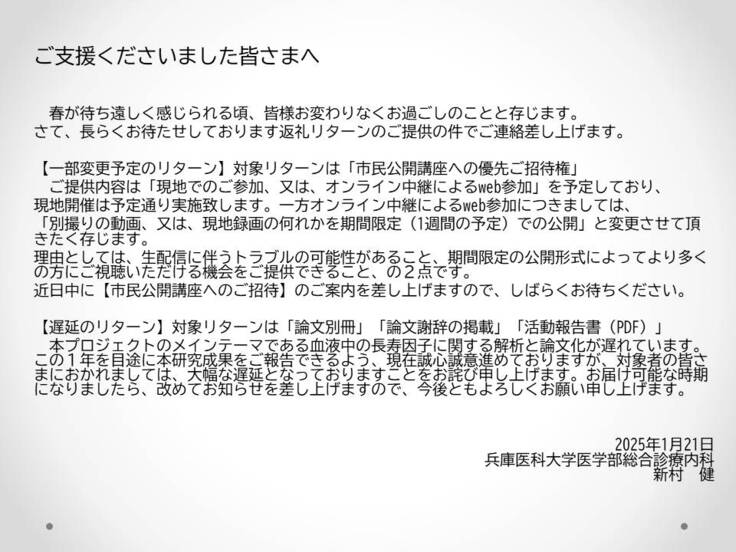 ※当研究室が実施する市民公開講座に1名さまを優先ご招待いたします。市民公開講座は2025年3月までに、兵庫県内で実施予定です。具体的な詳細は開催の2ヶ月前を目処にご連絡いたします。