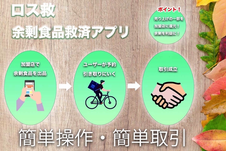 ロス救(アプリ)は飲食店(加盟店)と一般消費者(ユーザー)をつなぐプラットホームです。加盟店になって頂く加盟店は日頃より出てしまう余剰食品をロス救を介してアップロードして頂きます。それを見たユーザーは気に入った商品をアプリを介して予約。その後ユーザーが加盟店に引き取りに行くサービスです。