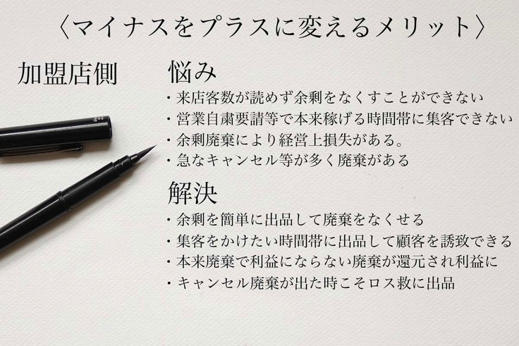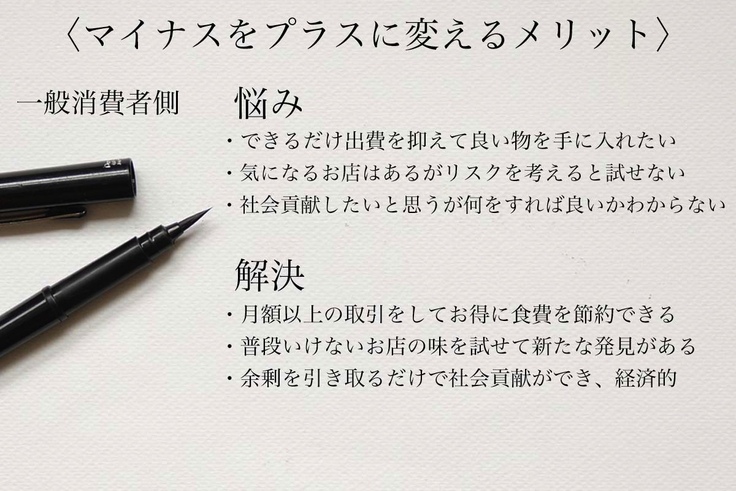 飲食店として余剰を出してしまうことに肩身を狭くしていましたが、地域貢献と捉えて頂くことができ、ユーザーとしては余剰を救うことで手軽に社会貢献ができるプラットホームとなります。