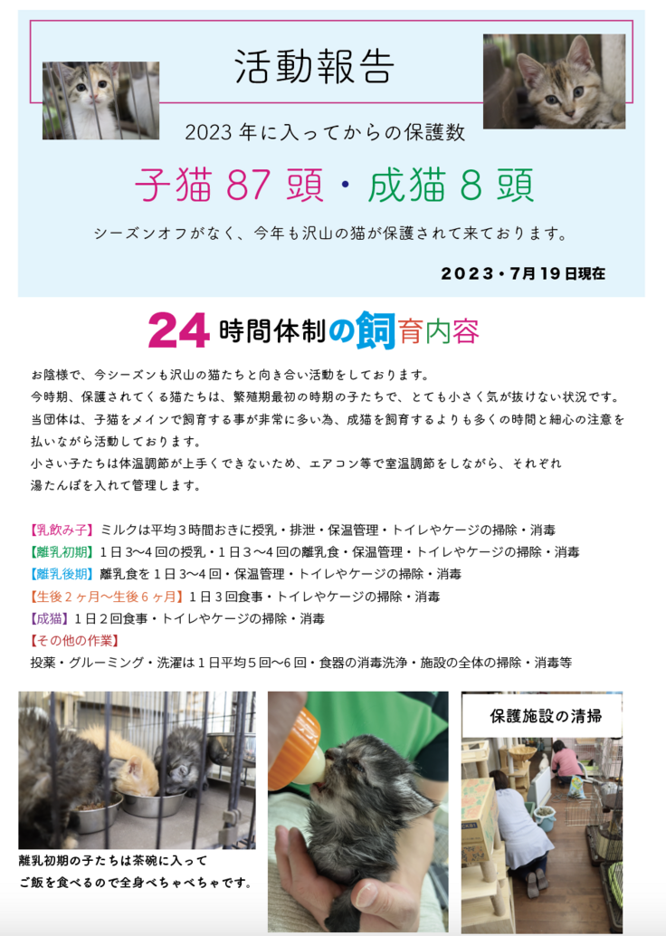 多くの皆様からクラウドファンディングなどで、たくさんのご支援を頂戴しており、皆様のご支援を大切に大切に切り崩しながら活動を続けておりましたが、保護猫が次から次へと保護されてくる中、物価高騰が長期化し現時点でとても厳しい状況です。