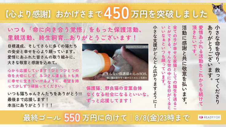 ですが、皆さまからのご支援をできる限り多く、猫たちの命を守るlove.labの活動そのものに活かしたいと願い、最終ゴールへの挑戦を決意しました。