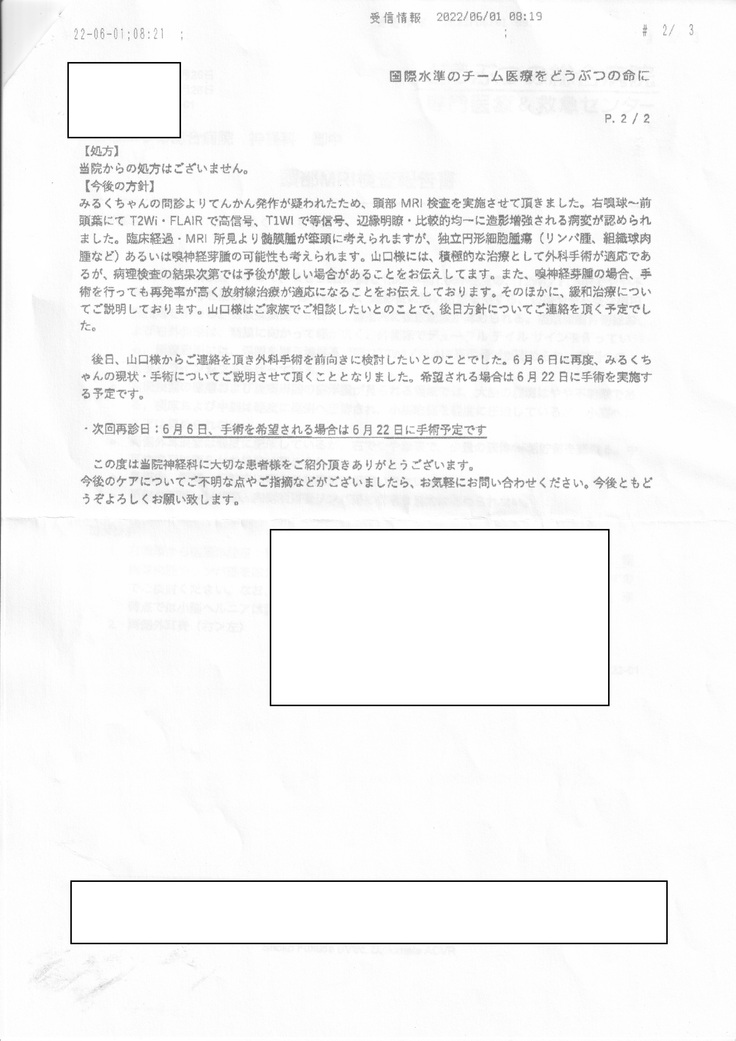 手術をしないと、余命半年と言われ、この腫瘍が大きくなれば、脳を圧迫して、痛みが出たり、脳障害が出る可能性があるということでした。