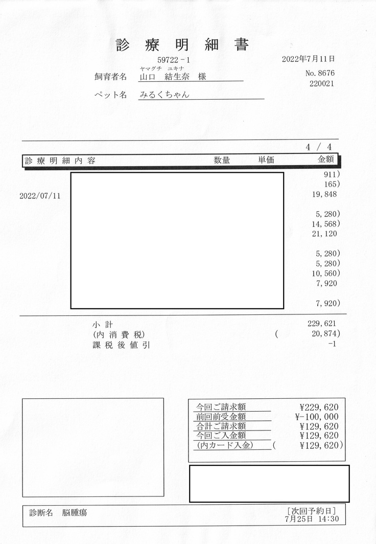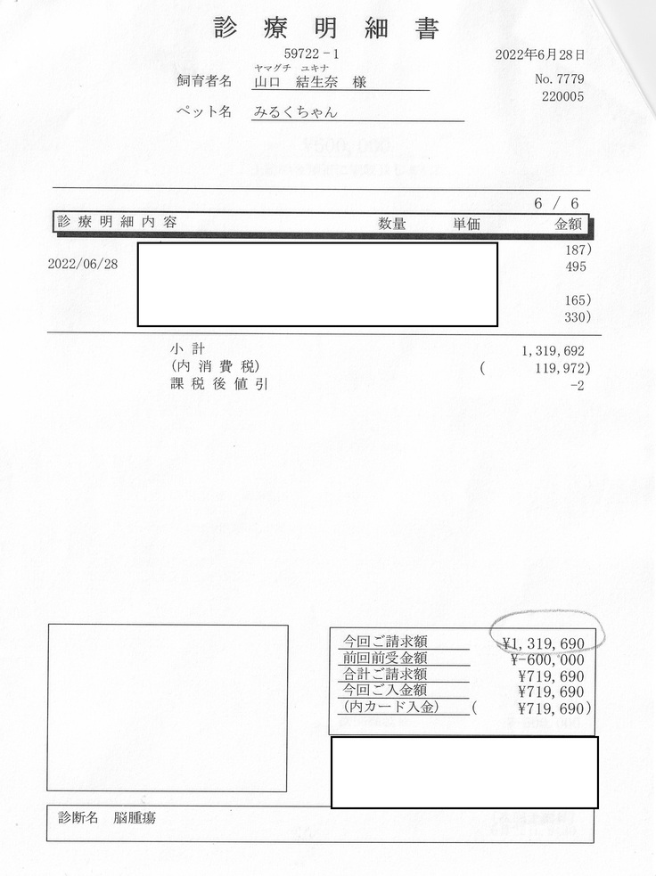一刻も早く手術をし、みるくの脳腫瘍の進行を食い止めたく、決断を最優先とし、高額な費用は借金することで現在は、治療を継続中です。