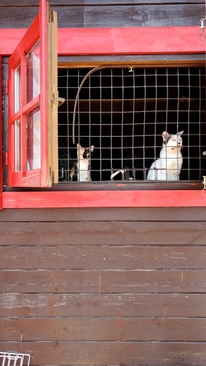 ↑↑↑ 体調崩している猫たちを個別に飼育管理する療養部屋(通称ICU)別棟の赤枠窓