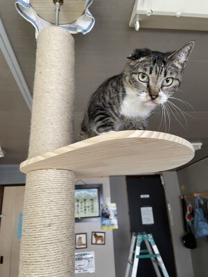 ↑↑↑ 今日もよろしくにゃん。キャットタワーからごあいさつ。