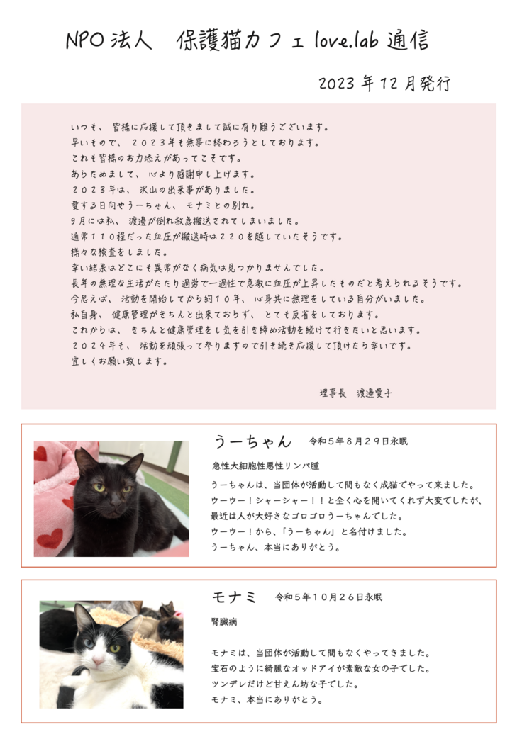 NPO 法人保護猫カフェ love.lab 理事長の渡邊愛子です。