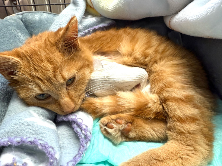 先日、交通事故に遭い大怪我をした茶トラくんが保護されてやって来ました。