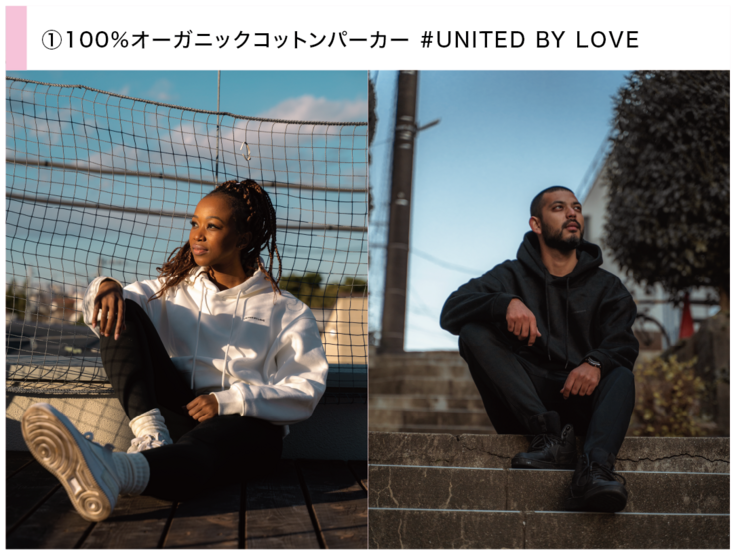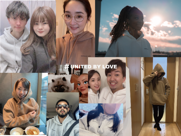パーカー胸元の【UNITED BY LOVE】には、【愛の力で一つに】。という意味が込められております。人種や国境を越えて、皆さんの愛をいただけましたら幸いです。