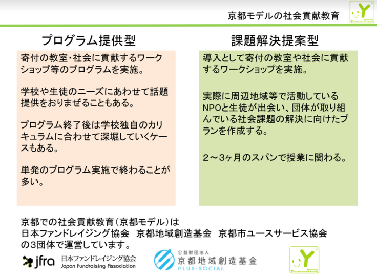 京都では、京都市ユースサービス協会と京都地域創造基金、弊協会の三者が協力して京都市内の高校に向けて、社会貢献教育プログラムを2017年度から提供してきました。京都府立すばる高校を中心に、府内3校でこれまで社会貢献教育を実施してきました。今年度からすばる高校では、「地域との協働による高等学校教育改革推進事業」指定校となり、これまでの取り組みが2年生の学科科目の一部として取り組まれることになりました。本取り組みの中心となって活躍頂いた、京都市ユースサービス協会の米原裕太郎さんから社会貢献教育展開へのメッセージ頂きましてました。
