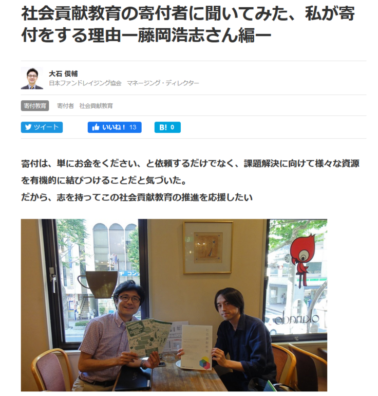 社会貢献教育事業に長年ご支援頂き、ご自身でも長野県松本市を中心に「多種多様な人々と協働した学びと実践の場」を提供されている藤岡浩志さんの取り組みは、松本市の社会課題の解決に向けて大学生を中心に学び・考え・実践するを繰り返されている取組みです。社会貢献教育が小学校から高校を主として対象としているのに対して、藤岡さんの取り組みはその後の大学生のアクション・実践の場として展開されており、本プロジェクトにも非常に深いご理解を頂いております。今後、一緒に連携をさせて頂くことも予定しており、長野でもまた違う形の取り組みが展開していきそうです!