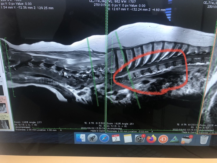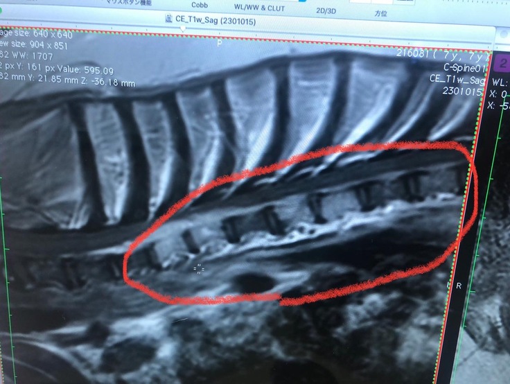 約3センチ下に、今回の病巣になります。この腫瘍が、後ろ足の麻痺、排尿困難を引き起こして