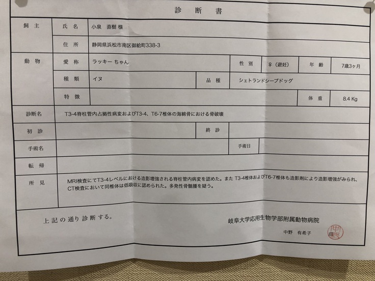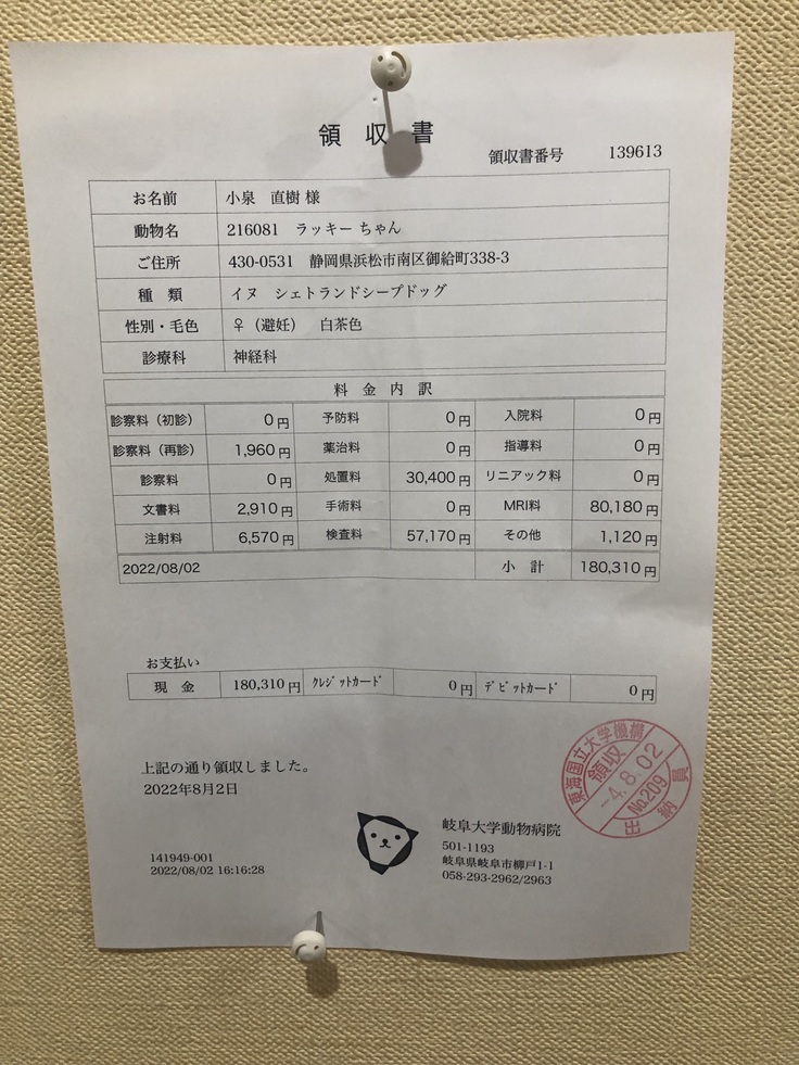 【下記、診断書 領収書は岐阜大学動物病院様にて、了承を得て掲載しています】