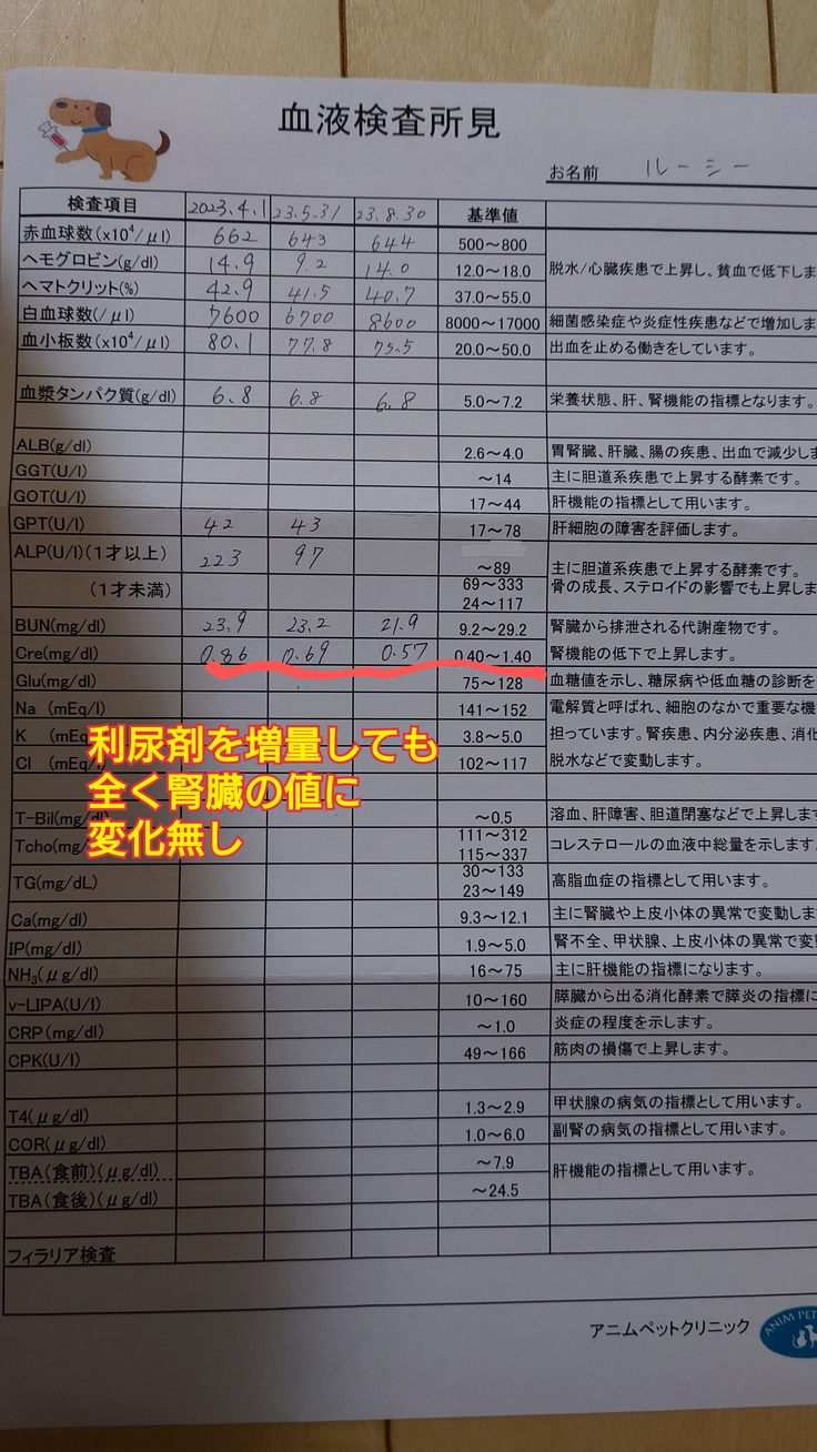 7月に利尿剤の量を2倍に増量したのですが、腎臓の値には全く影響が出ていません。