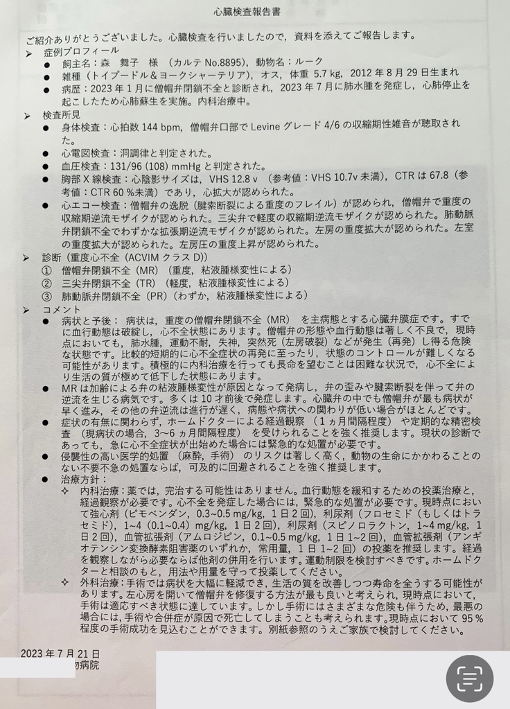 その後、また呼吸が苦しそうで一度酸素室に2日ほど入院しました。そして、僧帽弁閉鎖不全症手術の名医がいる病院を紹介され、そこで検査を受けてきた次第(7/21)です。